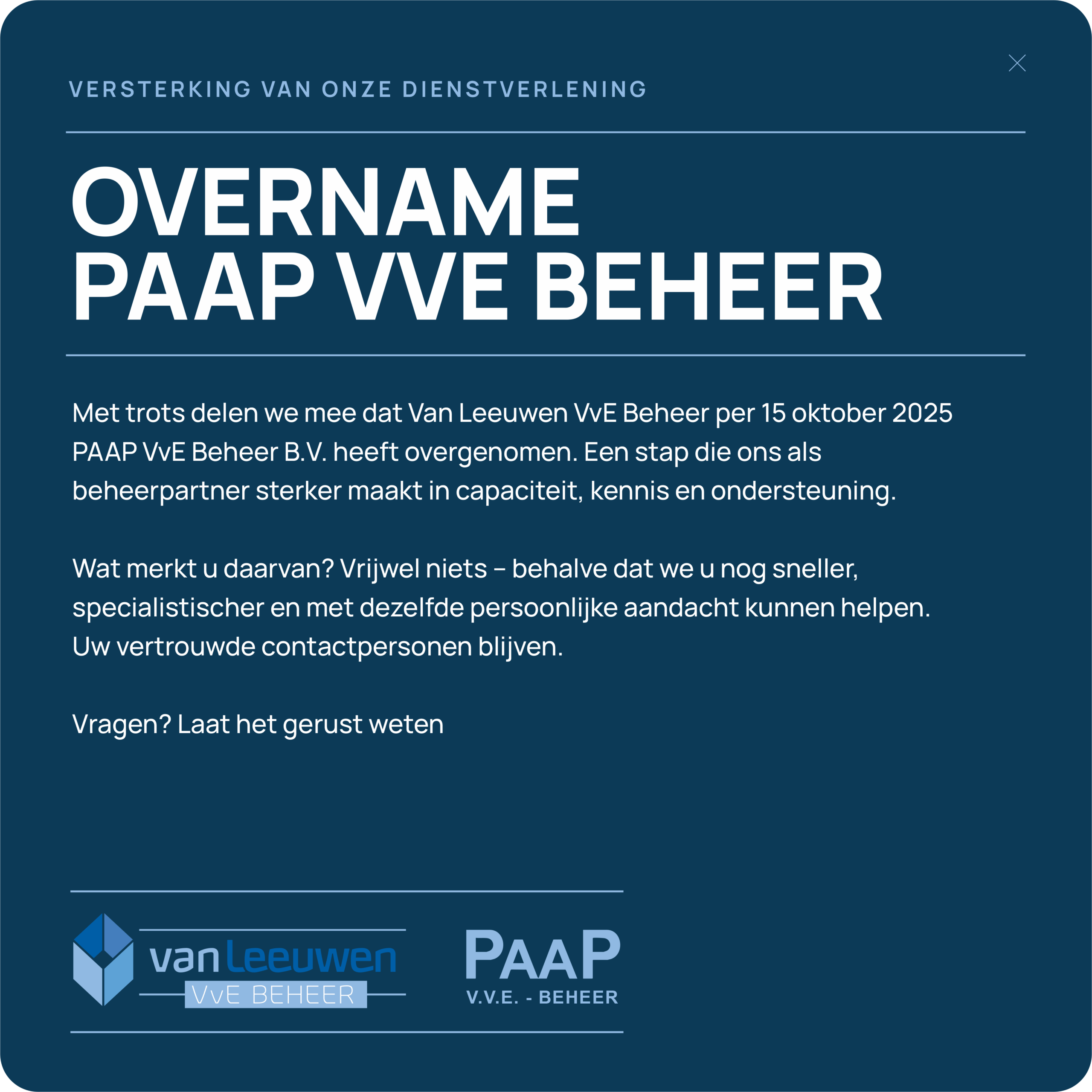 Wilt u meer informatie over de mogelijkheden bij Van Leeuwen VvE beheer. Neem dan contact met ons op of vraag een vrijblijvende offerte aan.